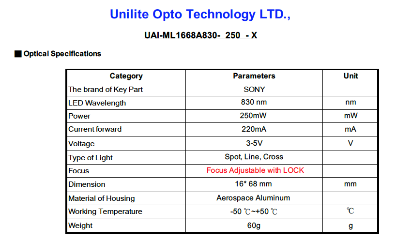 UAI-ML1668A830- 250 - X 830nm IR Laser Positioning